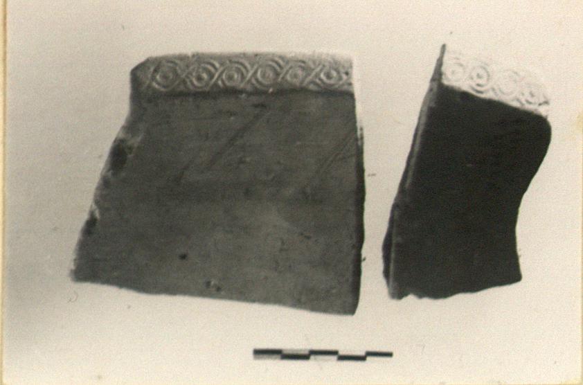 | Description: | Two non-joining rim fragments. Flat rim, sloping inward; trace of some attachment (handle?); steeply sloping sides. On rim, stamped double guilloche (raised) with dot in center. Heavy porous fabric; pinkish-buff, with surfacing. | |