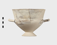 Description:   More than half of rim, part of body and one handle attachment preserved; mended from several pieces; foot and one handle missing and restored in plaster. Shape and fabric like P 23458 (ΣΑ 1948).