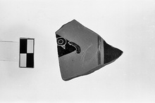 | Description: | Three non-joining fragments from an oinochoe or small amphora. Decoration in panel: a bird to right. a) Some of bird's head. b) Body. c) Tail. Red for beak and some of feathers. Buff clay and surface. | |