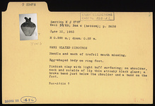 Description:   Handle and much of trefoil mouth missing. Egg-shaped body on ring foot. On shoulder, neck and outside of lip thin streaky black glaze; a brown band just below the shoulder and a band on the foot.