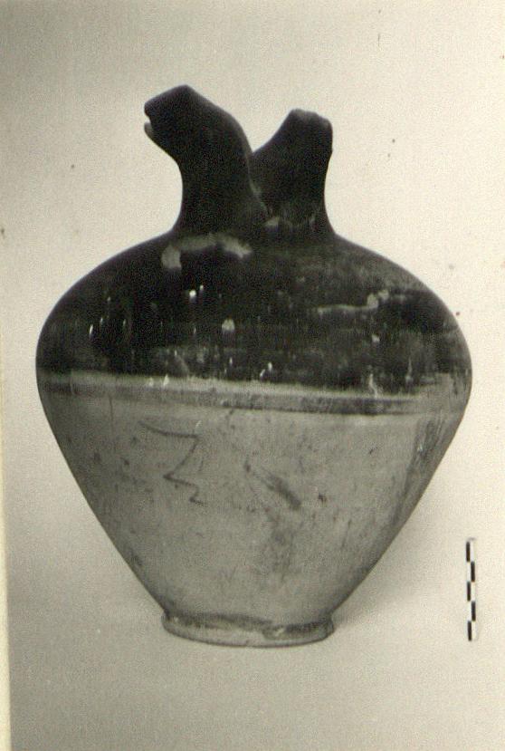 | Description: | Handle and much of trefoil mouth missing. Egg-shaped body on ring foot. On shoulder, neck and outside of lip thin streaky black glaze; a brown band just below the shoulder and a band on the foot. Pinkish clay with light buff surfacing. Non-Attic? | |