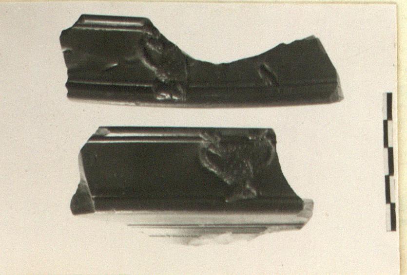 | Description: | Two non-joining fragments of rim and floor. From a deep plate with the wall everted horizontally below the vertical rim. Two appliqué ornaments on rim: jewelled krater. Arretine ware. | |