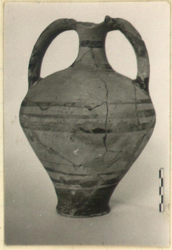 | Description: | Broken but largely complete except for spout; small wall fragments restored in plaster. Bottom slightly concave; piriform body, lop-sided; the rim on one side almost straight, traces of a projecting spout on the other; rolled handles from rim to shoulder. Buff clay with lighter buff surfacing. Banded decoration in dull black to brown glaze paint, considerably worn. | |