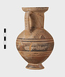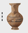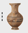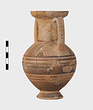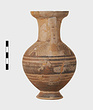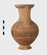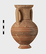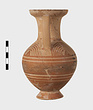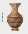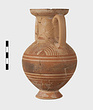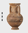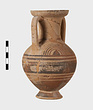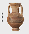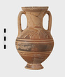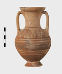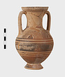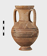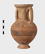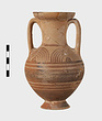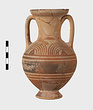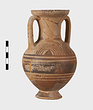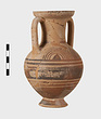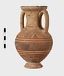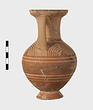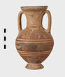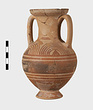 | Description: | Mended from many pieces; one handle and chips from rim, neck and base missing; restored in plaster. On either side, between handles, are two groups of concentric semicircles with triangular hearts. Bars on the handles. Rim and foot glazed. Pinkish-buff clay. Glaze unevenly fired, from black to light brown, and flaked. | |