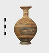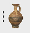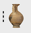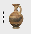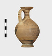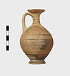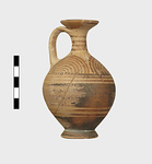 | Description: | Broken in several pieces and two small bits missing; restored in plaster. On shoulder, three groups of concentric semicircles; on neck, four rings; rim glazed above; on handle, bars; on wall, two pairs of reserved lines; no ring at base of handles. Buff clay. Thin glaze fired blackish to light brown in places. Small round hole in shoulder to right of handle. | |