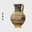 On shoulder, a panel of crosshatching is flanked to right and left by two groups of concentric semicircles filled with solid triangles. On wall, two groups of three reserved lines. On handle, crossbars. Ring at base.