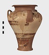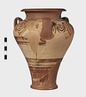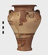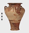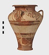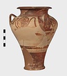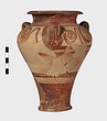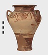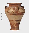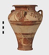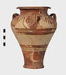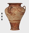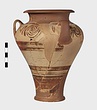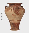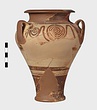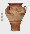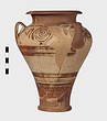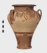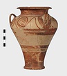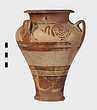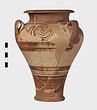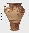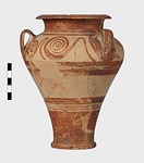 | Description: | Many fragments missing from wall and rim; restored. Broad downsloping rim; high shoulder; projecting ring foot; vertical band handles. On shoulder, between each pair of handles, a pair of spirals, one larger and one smaller, with connecting loops. The neck glazed inside and out, a reserved line on the rim. Bands on body below handles; lower wall glazed solid. Pinkish clay with light buff surfacing. Decoration in red-brown glaze paint, fairly firm. | |