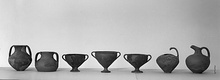 | Description: | Many wall fragments and part of rim missing and restored. Flat bottom; rounded body; lip out-turned; thin strap handles springing from lip. Coarse light brown clay surfaced with a thin red-brown slip or glaze wash. | |