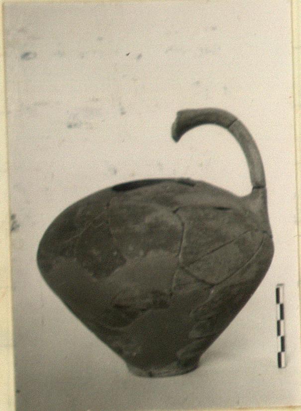 | Description: | Neck, mouth and wall fragments missing; partly restored. Flat bottom; piriform body; handle lightly ribbed. Buff clay. Covered with thin red glaze paint. ADDENDA Handle broken off. | |