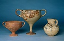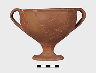 | Description: | Mended from many pieces; wall and rim fragments and one handle missing; restored in plaster. Low stem; spreading foot; underside of foot slightly concave, with a neat hemispherical depression at its center; deep bowl; narrow out-turned rim; low band handles. Coarse buff clay. Covered with dull red-brown glaze paint inside and out except on underside of foot. | |