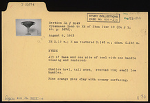 | Description: | All of base and one side of bowl with one handle missing and restored in plaster. Tall stem; shallow bowl; everted rim; small low handles. Fine orange-pink clay with creamy surfacing. | |