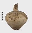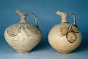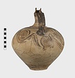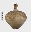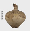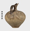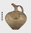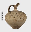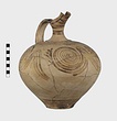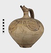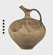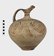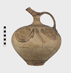 | Description: | Much broken but largely complete; small bits from base and wall restored. Broad piriform body on narrow flat bottom; trough spout; strap handle, ridged down the middle and with a bulge at the lower attachment; flat plastic ring at junction of neck and shoulder. Large spirals and groups of petals on shoulder; groups of bands on spout, neck and around lower wall; outside of handle glazed. Greenish-buff clay and surfacing. Black glaze much flaked. | |