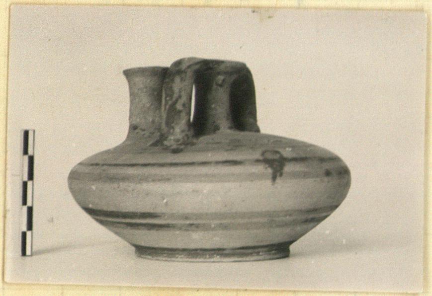 | Description: | Intact. Concentric circles on top of false mouth; concentric semicircles on shoulder. Bands around body and outer edge of foot. Pinkish-buff clay. Light red glaze paint, most flaked. | |