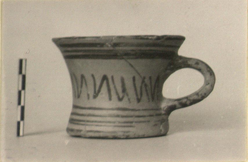 | Description: | Mended from several pieces; fragment from rim and bottom missing, restored in plaster. Mug with flat bottom, concave sides and single handle. Handle zone decorated with pattern like a retrograde N; above and below, lines. On the bottom, at the center, four concentric circles. Rim, edge of bottom and outside of handle glazed. Pinkish-buff clay. Light red glaze. | |