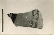 Decoration in matte light and dark brown glaze. A single zigzag line between two verticals. To left, part of a broad curved line.