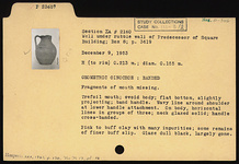 | Description: | Fragments of mouth missing. Flat bottom, slightly projecting; ovoid body; trefoil mouth; band handle. Wavy line around shoulder at lower handle attachment. On body, horizontal lines in groups of three; neck glazed solid; handle cross-banded. Pink to buff clay with many impurities; some remains of finer buff slip. Glaze dull black, largely gone. | |