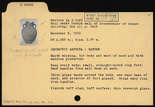 | Description: | Mouth missing, but body and most of neck and both handles preserved. Small, straight-sided ring foot; deep ovoid body; band handles from well down on neck. Three glaze bands around the body, one near base of neck, and exterior of foot glazed. Broad wavy line down handles. Pinkish-buff clay. Buff surface. Thin brownish glaze. ADDENDA Mouth fragment added. | |