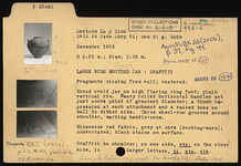 | Description: | Fragments missing from wall; restored. Broad ovoid jar on high flaring ring foot; plain vertical rim. Heavy rolled horizontal handles set just above point of greatest diameter; a thumb impression at each attachment and a raised boss on wall to either side. Three wheel-run grooves around shoulder marking handle zone. Graffiti on shoulder: on one side, Η; on the other side, in larger letters: Π, Η, Η Micaceous red fabric, gray at core (cooking ware); undecorated; black stains on surface. Cf. Agora XXXIII, no. 164. | |