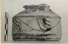 | Description: | Mended from many pieces; fragments of wall, and one handle, missing; lip chipped. Vertical-walled alabastron; sloping shoulder, low neck with flaring rim; flat bottom, three handles on shoulder. Lip, neck and handles glazed. On shoulder, between handles, running W's. On wall, groups of wavy verticals. Two bands at base of wall. On underside, concentric circles. Pale buff clay; decoration in black to brown glaze. | |