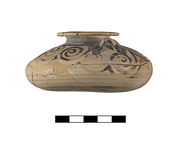 | Description: | Mended from several pieces; fragments of wall, two handles and parts of lip missing. Lightly domed alabastron, with broad rim, turned slightly down. Neck and rim glazed to top of shoulder; below this, a single band of glaze; on shoulder, running spirals. Handles glazed. On underside, groups of concentric circles. Light buff clay, pink at core. Dark brown glaze. | |