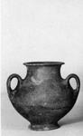 | Description: | Much of rim and neck, with top of one handle and large chip from foot missing. Plump amphora on flaring ring foot; wide neck, forming continuous curve with shoulder; projecting rim flat on top. Two small but broad band handles, set on shoulder. Coarse brownish micaceous clay; covered outside with thin gray to black glaze wash. | |