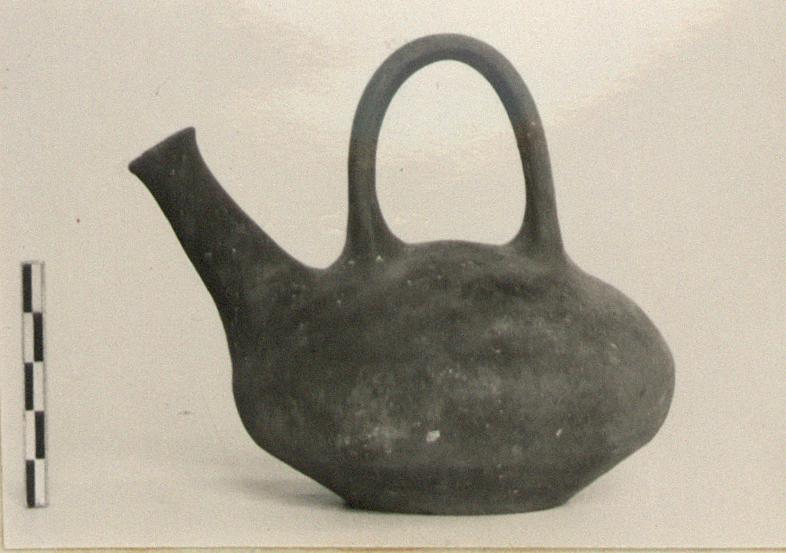 | Description: | Bottom cracked, apparently in making; otherwise intact. Shallow domed askos; flat bottom; long tubular spout set at an angle to shoulder, plain slightly flaring lip. High basket handle set on the top. Heavy brownish-buff fabric; covered overall with thin glaze wash, brown to gray. | |
