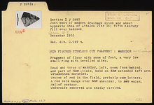 | Description: | Fragment of floor with some of foot, a very low small ring with bevelled sides. Head and torso of warrior, left, seen from behind, and part of the shield, held on the extended left arm. Ornamented corselet. Traces of red in the field, probably once letters. A red cord hangs over the shoulder, to his waist. Relief contour. Underside reserved and neatly circled. | |