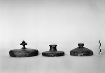 | Description: | Chip missing from side. Lid for a small lekanis (or a pyxis). Plain lid with flange below and high hollow knob above. Glazed all over; black below, brownish above. | |