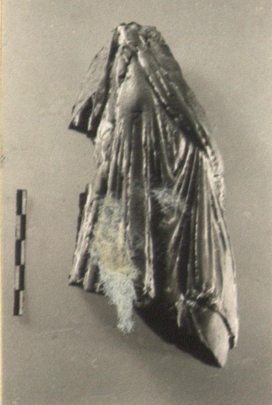 Description:   Torso of standing draped female preserved from shoulder to thigh; left shoulder missing, broken behind. She wears a heavy chiton with long ungirt overfold fastened on the right shoulder only. Considerable remains of white, with blue over, on the drapery. At the back along the right side, traces of attachment to vase, and a little black glaze.