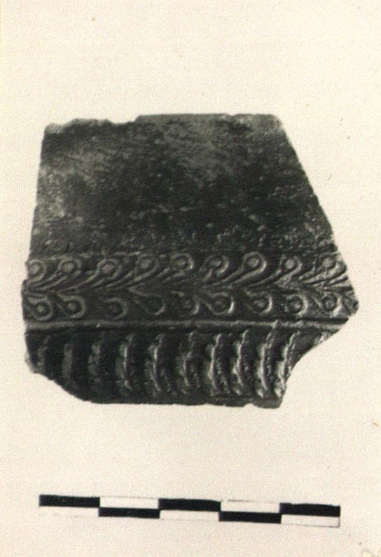 | Description: | Rim fragment. Nearly straight rim, lip only slightly everted, and with no scraped groove beneath. Rim plain above; lower down, a guilloche band above a zone of large leaves, overlapping from left to right. Hard gray clay; firm thin grayish-black glaze. | |