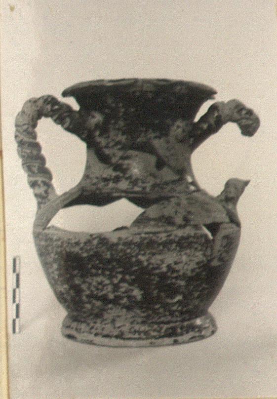 | Description: | Mended from many fragments; parts of wall and shoulder missing; rim chipped. Small amphora on broad molded ring foot. Everted, downsloping rim. Twisted rising handles; a large boss to either side of the upper handle attachments. Ridge at junction of neck and shoulder. Decoration in added clay and white. On the shoulder, checkerboards and diminishing rectangles. On the neck, a pair of bands with a wavy line between; above this, a double line of scallops, from which rise short petals. Good black glaze, much pitted. | |