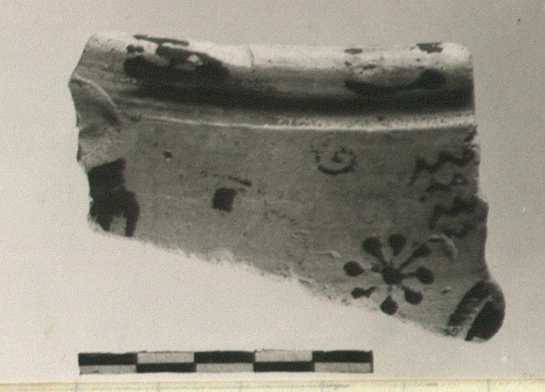 | Description: | Rim fragment with lion's head in outline. Filling ornaments: rosette, hanging spirals and chevrons. Broad cross stripes on rim. Glaze black to brown; a few traces of white. | |