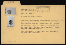 | Description: | Both handles missing. Raised base, left rough. On shoulder, tongues; on front, woman's head in kerchief, left; on back, large palmette. Poor thin glaze, so badly worn that decoration is only just discernable. | |