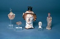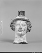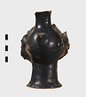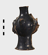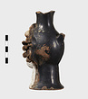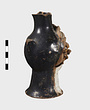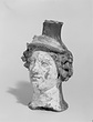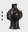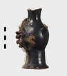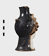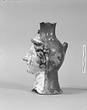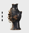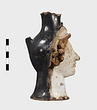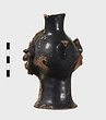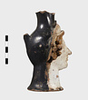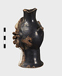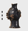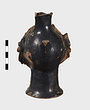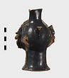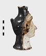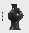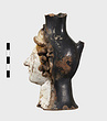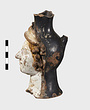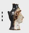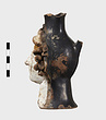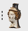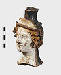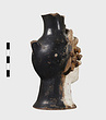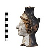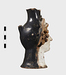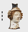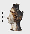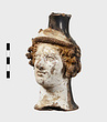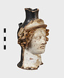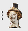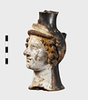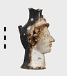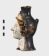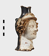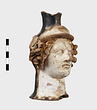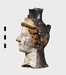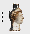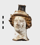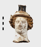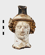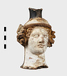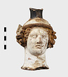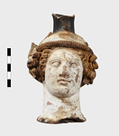 | Description: | Handle, mouth, chip from bottom, part of diadem(?), and some curls, missing. Head inclining towards her proper left. Heavy spreading neck with Venus rings indicated; full mouth, long nose. Most of forehead shown. Curly hair with additional corkscrew-curls stuck one by one separately; some of them show above the broad head band she is wearing. Below the band, woolen wreath. Behind the ears projections, one broken off, the other chipped; traces of something else coming down on each side of the face behind the hair. Had the head been janiform, these things could very easily be explained as the back of the ears and round beard of the Silen's head (e.g. JHS 49 (1929), p. 73, fig. 26). The head, fillet, "ears" and "beard" covered with white, used rather as underpainting; traces of pink preserved in several places. On wreath and hair, dark yellow. Good glaze. White gone at places. Cf. in general: CVA Oxford, p. 10, text to pl. IV:7-8; JdI 32 (1917) p. 56 (BM E 790). | |