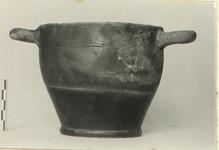 Description:   Found intact except for one handle, later added from sherds. Attic type, rim slightly flared; upper part of exterior and edge of rim inside glazed red from stacking. Space inside ring foot reserved and reddened; decorated with central dot and circle.