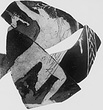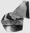 | Description: | Several joining fragments preserve part of the rim, neck and shoulder, with the handle. Of the decoration, a little of the upper border and of the border to either side remains: above, framed palmettes, topped by a row of egg pattern; to sides, chevrons. Another piece, mended from many, gives something of the figured scene, a komos. At right, a youth running right, looking back; a torch in his left hand, his right arm raised; cloak over left shoulder; wreath. Following him, a flute-girl, and at left, one foot of third figure. Another small fragment, gives part of drapery and thigh of left figure. No relief contour. Careful work, battered. | |