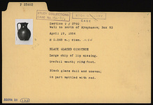 | Description: | Large chip of lip missing. Ring foot; trefoil mouth. Black glaze dull and uneven; in part mottled with red. | |