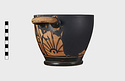 Dull glaze, somewhat worn, especially on handle. Resting surface and space inside reserved; three circles and dot at center.