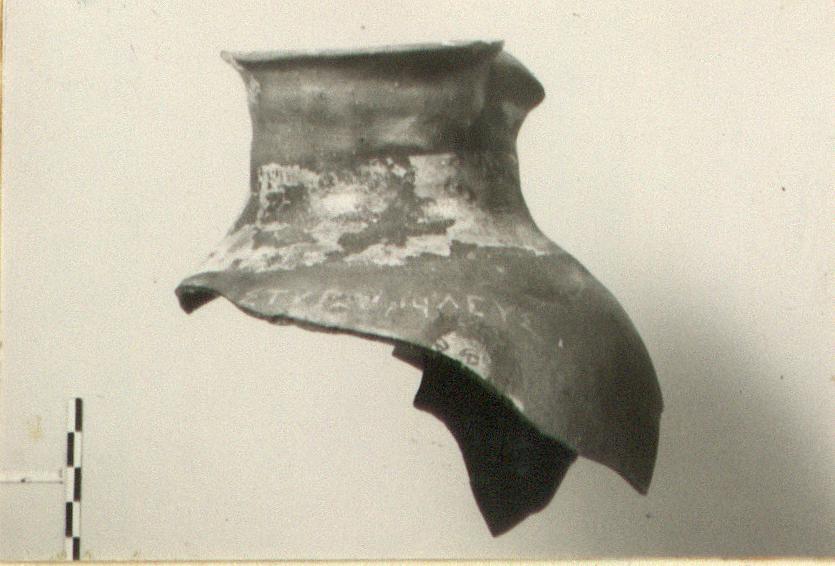 | Description: | Upper part preserved; cf. P 23900 (Τ 2840). Around neck, a wide band of white paint; on this band is added a wreath of ivy leaves in bluish-green, with some leaves extending below the white on to the dark clay. On body, part of a head preserved facing; face painted light pink. Above, inscription in white paint; incomplete at left. Gritty micaceous brown clay like that of undecorated household pots. | |