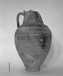 Description:   One handle, rim missing. Ring foot, double rolled handles. Body banded solid at base and shoulder. On neck concentric triangles with double wavy lines and hourglass motifs to either side.