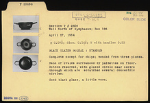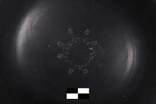 | Description: | Complete except for chips; mended from three pieces. Band of ovules surrounded by palmettes on floor. Good black glaze, a little worn. Bottom reserved, with glazed circle near center, through which are scratched several concentric circles. | |