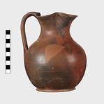 | Description: | Hole in side and small piece missing from neck. Ring foot; trefoil lip. Thin glaze fired red to brown. Cf. Agora XII, no. 120. | |
