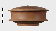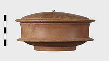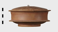 | Description: | Chips missing from lip of pyxis; lid broken in many pieces; a little of top missing including center. Shape C, plain except for a light cushioning around center of lid. Possible trace of hole for ring handle. Thin fabric. Fine pinkish-buff clay, with polished surface, washed with miltos inside and out. Unglazed. ADDENDA Restored in plaster and small wire loop added on lid. | |