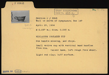 | Description: | One handle and chips missing. Small votive cup with vertical band handles from rim; raised base, left rough from wheel. Light red clay; buff surface. Miniature votive cup. | |