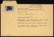 | Description: | Fragmentary; mended from several pieces; spout, handle and part of top missing. Crouching lion on one side, panther on other. No relief contour. Rather dull glaze; brown wash inside. Bottom unglazed. | |