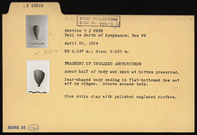 Description:   About half of body and knob at bottom preserved. Pear-shaped body ending in flat-bottomed toe set off by ridges. Groove around body.