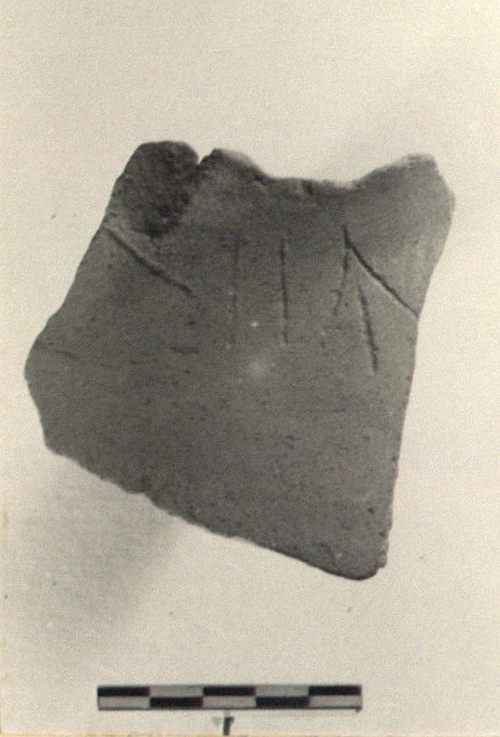 | Description: | Small fragment from shoulder. Inscribed near base of neck: <graphic> Micaceous clay; buff surface, red core. | |
