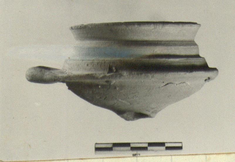 | Description: | Stem broken off; one handle missing and chips. Well made large kernos with four string-holes in flange (one not pierced through). Unglazed; hard red clay (cooking fabric). | |