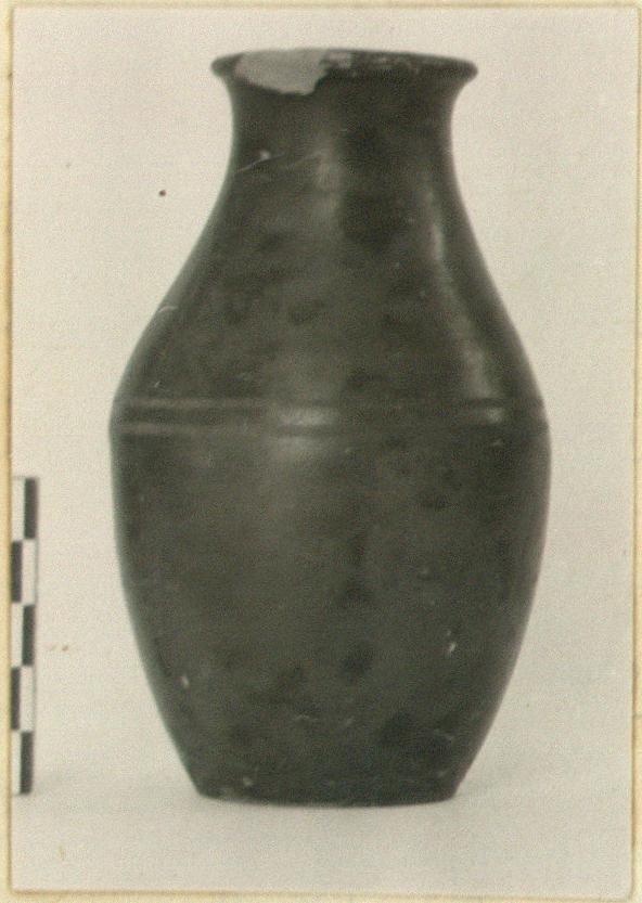 | Description: | Handle and part of wall missing. Tall and slender; flat-bottomed. Brownish-black glaze with two narrow purple bands around waist. | |