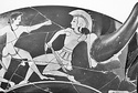 A) and B) Fight. On each side there are two pairs in single combat, with a warrior at center between the two pairs. The pair at the right, on each side, consists of a warrior and a youth wearing, on A, short himation and wreath, and carrying a shield; on B, short sleeved chiton, wreath, and carrying a sword.